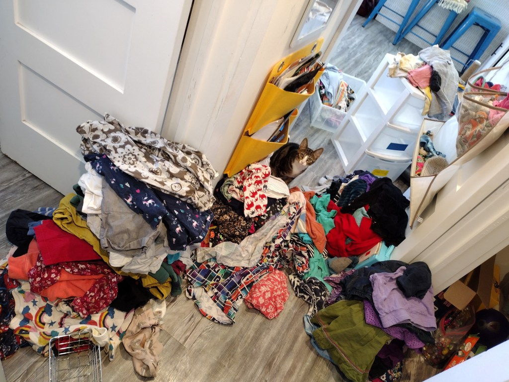 I live with three kids in 400 square feet. The kids keep their clothes and games in a single shared closet, and if you’ve ever met children, you can imagine how this closet sometimes looks. Overflowing drawers. Outgrown or unfavored clothes shoved into far corners or cast unceremoniously to the floor. Orphaned puzzle pieces and a teetering tower of board games. Recently the closet reached critical mass. It had become a barely functional anxiety including disaster; something clearly had to be done. I dumped out every single clothing drawer into the hallway. And promptly thought “Well crap, now I’m stuck”. As in, I literally couldn’t move from the hallway until I’d dealt with the chaos I’d created. Where to even start?? Item by item. It was definitely safe to get rid of the 3T shorts the 7 year olds had been squeezing into; those went into the donate pile. A few things went into a sell pile, items I’d paid for that I thought would have high enough resale value to make it worth my while. Items that still fit (and still actually get worn) were sorted into piles by category: leggings, long sleeves, short sleeves, etc. Once everything was culled and sorted, I was able to get a clear picture of what we actually had and assess the storage needs. It turned out that pajamas didn’t need a big drawer, so they were downgraded to a smaller one, while long sleeve shirts – which had previously overflowed from their small drawer – got upgraded to a bigger space. The donation pile got put into a bag and immediately taken to my car (lest it sit and fester in Donation Purgatory), and the sell pile went into a labeled box and moved into my bedroom. I labeled the freshly organized drawers and felt like a freaking rockstar. Almost two hours had passed and I didn’t have the steam to tackle the game shelf, so I only picked up a few straggling game pieces that had landed on the floor and left the project for another day. But the results still felt amazing! Even the kids commented on the change. “Wow, the closet looks great, Mom! I can actually open the drawers now!” “I didn’t realize I had this many pants!” And the best part? I don’t have a sinking feeling in my gut every time I open the closet door.